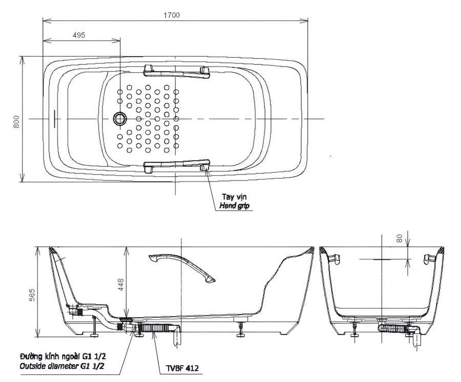 Sản phẩm có tay vịn, đã bao gồm ống nối thoát thải bồn tắm